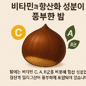 밤에는 비타민 C, A, B군을 비롯해 항산화 성분인 갈산과 엘라그산이 풍부하게 포함되어 있습니다. 이러한 성분은 체내 염증을 줄이고, 면역력을 향상하며, 노화를 늦추는 데 효과적입니다.