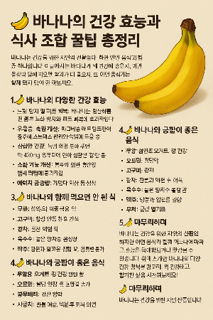 바나나는 건강을 위한 자연의 선물입니다. 하지만 어떤 음식과 함께 먹느냐에 따라 그 효능은 극대화되거나 반감될 수 있습니다. 위에 소개한 바나나의 다양한 건강 정보를 참고해, 더 건강하고 활기찬 삶을 시작해 보세요!